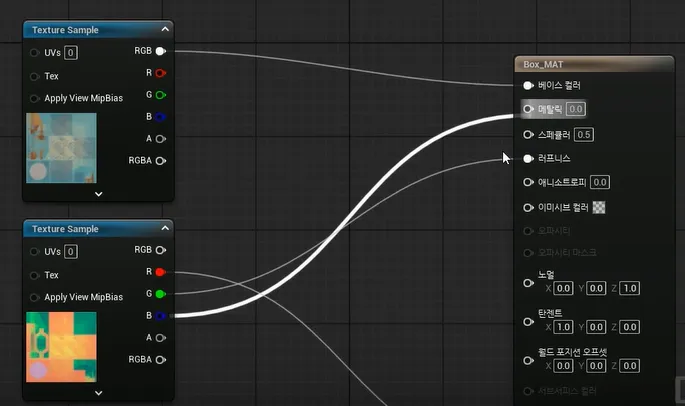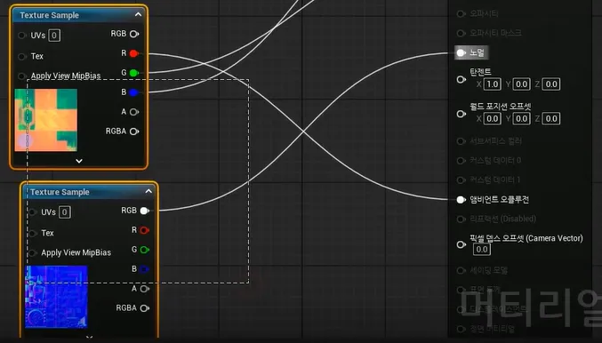 방법 3) 머터리얼 창 - 카테고리 검색 : Texture Sample 드래그 드랍 → 해당 맵을 노드에 드래그드랍